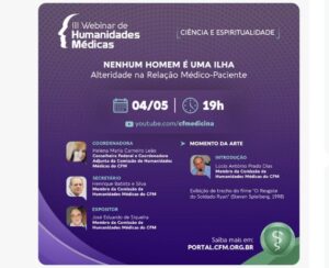 www.twitter.com/luciopradodias Nesta quarta-feira – 04/05 – às 19horas, pelo Youtube do Conselho Federal de Medicina, a Comissão de Humanidades Médicas do órgão, realiza o III Webinar “Ciência e Espiritualidade”, com a conferência “Nenhum Homem é uma Ilha”, do Prof. José Eduardo Siqueira.