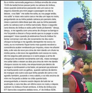 namorada. BO foi feito! Será que os meliantes serão punidos? Blog pede que direitos humanos da OAB/SE entre no caso Um vídeo viralizou e chocou os sergipanos ontem, 03, nas redes sociais. Segundo o Boletim de Ocorrência, o cidadão, Edivaildo Jhon Francis Oliveira Santos silva, se deslocava juntamente com a namorada no ônibus, Aracaju/Barra, quando os dois passaram juntos pela catraca. No BO, Edivaildo informou que foi surpreendido por um homem, se farda e identificação, que lhe agarrou pela camisa com violência, enquanto outro homem lhe desferiu choques elétricos com um arma e recebeu dois socos na cara. Mesmo informando que pagaria a segunda passagem, Edivaildo nada adiantou sendo jogado para fora do veículo onde foi agredido mais ainda, conforme o vídeo. Um absurdo! Se os homens, ou melhor, os agressores trabalham para a empresa é preciso responsabilizar a todos. Se passou a catraca com outra pessoa é chamar a atenção e no máximo levar para a polícia. Jamais agredir qualquer cidadão. O cidadão agredido está desempregado. O blog apela para que a OAB/SE, através da área dos direitos humanos entre no caso. O vídeo: