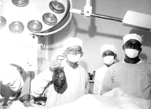 Augusto exibe a peça cirúrgica retirada. Ao seu lado, Aristóles e mais atrás o acadêmico Eduardo Garcia