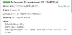 feira, 30, os embargos de declaração impetrados por Belivaldo Chagas contra a decisão do pleno que cassou o mandato dele e de Eliane Aquino por abuso do poder econômico.