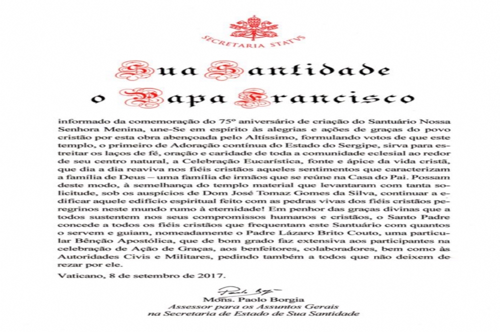 Papa Francisco envia mensagem para o Jubileu de 75 anos do Santuário Nossa Senhora Menina. O Monsenhor Paolo Borgia, assessor para assuntos gerais na Secretaria de Estado de Sua Santidade, comunicou os votos do Papa Francisco, a todos os fiéis cristãos que frequentam o Santuário de Nossa Senhora Menina pelo Jubileu de 75 anos e faz referência ao padre Lázaro Brito Couto, com uma particular Benção Apostólica. Veja o print ao lado.