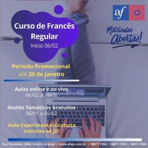 Aliança oferece Cursos de Francês on-line a partir de janeiro Os cursos de Francês da Aliança Francesa estão com Matrículas Abertas, cujas aulas começam no dia 6 de fevereiro, para os cursos regulares, através de uma plataforma interativa, de forma online e ao vivo, com um professor. Matricule-se até o dia 20 de janeiro e usufrua do período promocional. Você também pode se inscrever gratuitamente numa Aula Experimental de Francês. Para mais informações, acesse www.afaju.com.br/matriculas ou entre em contato pelos números 79 98877-7904 98877-7905 98877-7906 3211-9868.