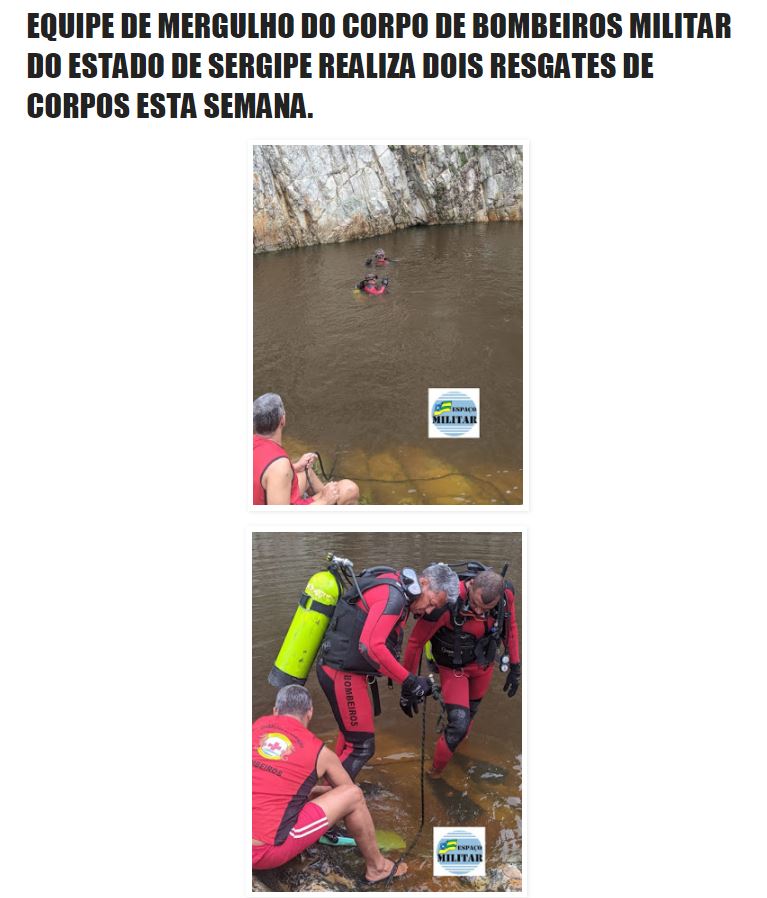 A equipe de mergulho do Corpo de Bombeiros Militar do Estado de Sergipe (CBMSE) realizou dois resgates de corpos esta semana.