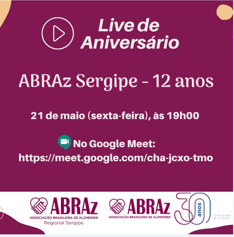 ABRAz Sergipe celebra 12 anos de ações voltadas para idosos e pacientes com Alzheimer A Associação Brasileira de Alzheimer (ABRAz) celebra HOJE, 21, 12 anos de fundação da instituição no Estado de Sergipe. A data marca o início dos trabalhos em favor do público idoso, especialmente os fragilizados pela demência, e dos seus familiares e cuidadores. Neste ano, por conta da pandemia da Covid-19 e a impossibilidade de reunir pessoas presencialmente, a ABRAz fará uma live para comemorar a data. O evento será realizado na plataforma Google Meet, dia 21 de maio, às 19h. A live contará com a participação de diretores da instituição, profissionais voluntários, cuidadores familiares, idosos atendidos, patrocinadores, dentre outras pessoas que contribuem nas ações da ABRAz Sergipe. Também haverá o espaço para que a população tire suas dúvidas sobre a instituição, assim como para aqueles que já conhecem o trabalho realizado pela ABRAz. Para participar, o interessado deve acessar o link https://bit.ly/2Rpp6xc.