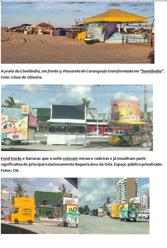 E lá embaixo, na areia da praia, as barracas se proliferaram de todos os tipos e gostos. Uma verdadeira favela a céu aberto. Bem definiu o fotojornalista César de Oliveira pelas redes sociais: “Essa é a situação da antiga praia da Cinelândia, hoje “favelândia”, um dos locais mais agradáveis antigamente e que agora se transformou num lugar horrível, uma verdadeira Babel. Espero que ainda dê tempo de corrigir esse erro absurdo e que os órgãos responsáveis chamem o feito à ordem.”
