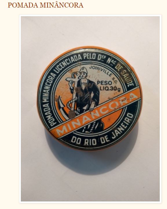 A pomada Minâncora saiu de moda, junto com a Emulsão de Scott, Biotônico Fontoura, instantina, leite de magnésia, óleo de rícino, pó de sulfanilamida, violeta genciana, elixir paregórico, mercúrio cromo, neocid pó e uvilon.