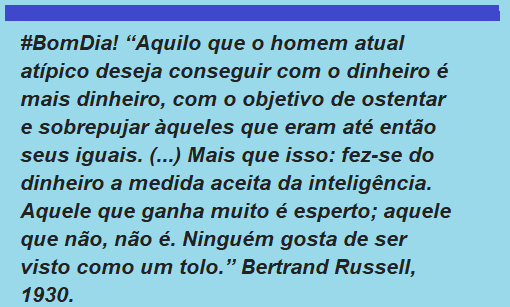 “Aquilo que o homem atual atípico deseja conseguir com o dinheiro é mais dinheiro, com o objetivo de ostentar e sobrepujar àqueles que eram até então seus iguais. (…) Mais que isso: fez-se do dinheiro a medida aceita da inteligência. Aquele que ganha muito é esperto; aquele que não, não é. Ninguém gosta de ser visto como um tolo.” Bertrand Russell, 1930