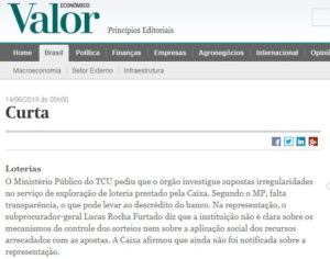 Loterias da Caixa: MP do TCU pede que sejam investigadas possíveis irregularidades Deu no Valor: O Ministério Público do TCU pediu que o órgão investigue supostas irregularidades no serviço de exploração de loteria prestado pela Caixa. Segundo o MP, falta transparência, o que pode levar ao descrédito do banco. Na representação, o subprocurador-geral Lucas Rocha Furtado diz que a instituição não é clara sobre os mecanismos de controle dos sorteios nem sobre a aplicação social dos recursos arrecadados com as apostas. A Caixa afirmou que ainda não foi notificada sobre a representação.