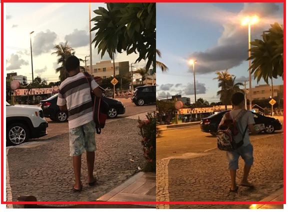 As fotos ao lado são de duas crianças que estavam “vendendo” balas e andam agora com bornais nas costas. Parece que todas são comandadas pela mesma pessoa. Não são crianças e adolescentes que moram nas ruas ou abandonadas. São crianças que certamente são exploradas por seus pais ou parentes.