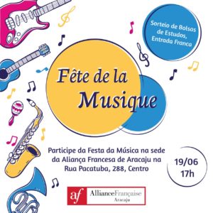 Francês, a Aliança Francesa organiza pela primeira vez a Festa da Música, graças ao apoio da FUNCAJU. O evento, que é comemorado na França no dia 21 de junho, revela talentos da música bem como apresenta artistas já consagrados. Em Aracaju, a festa será realizada no dia 19 de junho, às 17h, na sede da Aliança Francesa e contará com a apresentação dos cantores que participaram do Festival da Canção Francesa 2018 tais como Amora Valente, Célia Gil, Cristhiane de Lis, Daniela de Hollanda, Jeca e Laércio Souza, que proporcionarão ao público um riquíssimo repertório franco-brasileiro. A Festa da Música contará ainda com a apresentação dos alunos da Aliança Francesa, entre os quais destaca-se a turma de crianças, que apresentará em coral o hino francês, a Marselhesa. O evento tem entrada franca e proporcionará ao público presente o sorteio de bolsas de estudos de francês. Acesse e participe: www.afaju.com.br.