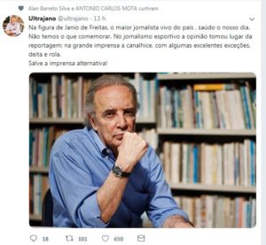 www.twitter.com/ultrajano Na figura de Jânio de Freitas, o maior jornalista vivo do país , saúdo o nosso dia. Não temos o que comemorar. No jornalismo esportivo a opinião tomou lugar da reportagem; na grande imprensa a canalhice, com algumas excelentes exceções, deita e rola. Salve a imprensa alternativa!