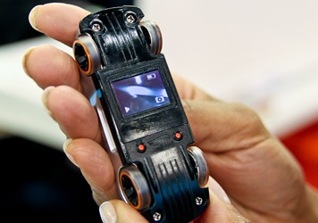 os carrinhos da Hot Wheels. Agora, a fabricante dos carros vai ficar um pouco mais hi-tech. Alguns modelos de carros terão uma câmera na frente de carro que vai permitir gravar as “corridas” que feitas pelos carrinhos. As gravações ficarão armazenadas no próprio carro e um monitor de LCD (ver foto) no fundo do carro vai permitir assistir o vídeo. Além disso, os filmes podem ser passados para o PC via porta USB. O preço? Esse é um mero detalhe.