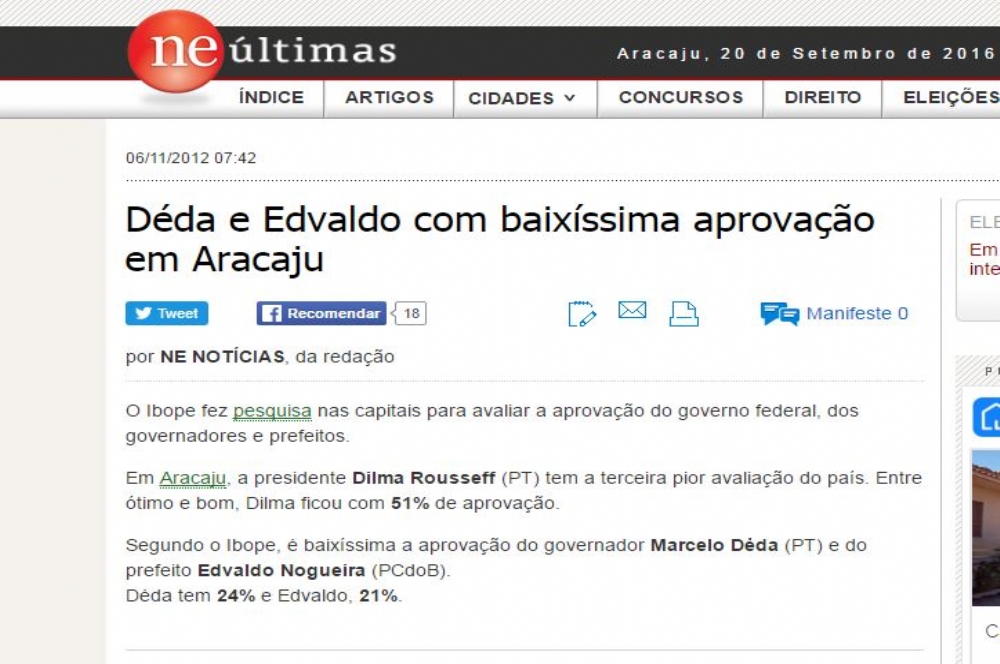 Ao lado o “print” da matéria publicada em 06 de novembro de 2012 pelo NeNotícias:O Ibope fez pesquisa nas capitais para avaliar a aprovação do governo federal, dos governadores e prefeitos.Em Aracaju, a presidente Dilma Rousseff (PT) tem a terceira pior avaliação do país. Entre ótimo e bom, Dilma ficou com 51% de aprovação.Segundo o Ibope, e baixíssima a aprovação do governador Marcelo Deda (PT) e do prefeito Edvaldo Nogueira (PCdoB).Deda tem 24% e Edvaldo, 21%.