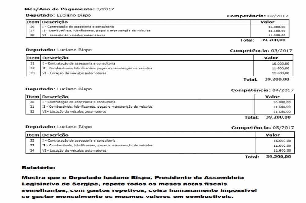 Bispo e o milagre do mesmo trajeto na Alese – Um relatório recebido pelo blog mostra que nos últimos anos o deputado estadual Luciano Bispo, consegue gastar o mesmo valor de combustíveis todos os meses. Será um milagre ou o carro dele faz um único trajeto? Só chamando Carlinhos Vidente…