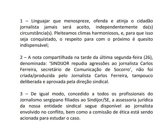 Do blog: Depois que Paulo Souza deixou o comando do SINDIJOR/SE este jornalista deixou de contribuir com a entidade. O blog alerta aos colegas: deixem as questiúnculas políticas de direita ou de esquerda para fora da entidade. O sindicato não é para proteger apenas quem segue a linha ideológica dos que estão no comando. Célio Nunes, Leó Filho, Theotônio Neto, Antônio Vieira, Milton Alves, Jairo Alves, Niúra Belchior, Ofélia Onias, e tantos outros (inclusive Paulo Sousa) que fogem da memória agora, não estiveram no mesmo lado partidário todo tempo, mas na hora de defender os colegas não titubeavam. Fica a dica! A nota do SINDIJOR/SE: