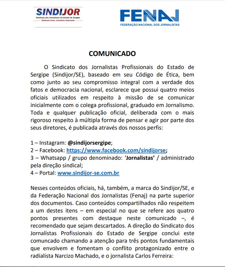 O blog publica hoje uma nota do SINDIJORSE, porém informa que a nota publicada ontem, 27, enviada pelo jornalista Carlos Ferreira foi feita pelo diretor de comunicação do Sindicato, Paulo Souza, com a autorização do presidente Milton Júnior. O jornalista Carlos Ferreira informa que vai ingressar na Justiça contra o radialista Narcizo Machado e contra a FAN FM pela acusação de falsificação da nota. Como também pedirá que o conselho de ética reveja a nota de hoje, já que diz que ele não produziu, mas omitiu a autoria da mesma.