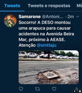 Arapuca da Deso denunciada por Samarone vem causando acidentes Na última sexta-feira, 26, o blog publicou uma foto do twitter de Antônio Samarone alertando para uma arapuca que a Deso montou na Avenida Beira Mar próximo a AEASE, ao lado do Parque da Sementeira. Não deu outra o blog já começou a receber reclamações de acidentes. Leia essa de um dos leitores: “Bom dia caro Cláudio, sobre o buraco ao redor da Caixa, na Beira Mar a que Samarone se refere no final, essa semana indo com minha mãe no carro, bati o pneu, por pouco não estourou, ou pior não quebrou a suspensão, realmente está muito perigoso, um carro grande tipo caminhonete ou USV, passa tranquilo por ser grande ou espaço entre eixos maior, mas carro menor pra causar um acidente é questão de tempo.”