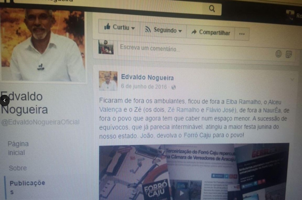 início de junho de 2016, criticando a mudança no Forró Caju feita por João Alves. “… Por isso é muito triste, hoje, ver o Forró Caju sendo diminuído e elitizado por João Alves Filho e entregue a iniciativa privada. Os aracajuanos não merecem isso”.