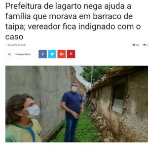 Prefeitura de lagarto nega ajuda a família que morava em barraco de taipa; vereador fica indignado com o caso Deu no “O Bolo é Grande”: Dona Maria José residia em um barraco feito de taipa no Povoado Olhos D´Água, em Lagarto. As brechas pelo lado de fora da moradia, serviam de espaço para o barbeiro, o transmissor da doença de Chagas. Quando chovia, à casa de Dona Maria ficava alagada. Alarmado com a situação, o vereador Washington da Mariquita (MDB) organizou uma campanha para construir uma nova casa para ela e sua família. No ensejo, ele solicitou uma