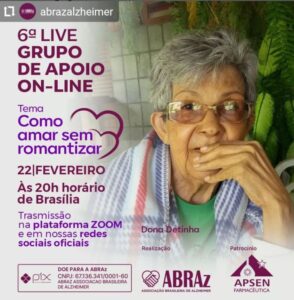 COMO AMAR SEM ROMANTIZAR – 6a Live Nova Temporada Grupos de Apoio On-line ABRAz – Associação Brasileira de Alzheimer. Hoje, 22/02. ‘’Pequenos prazeres refletem grandes alegrias. Levar Mamy para uma visita ao sítio de amigos foi uma ousadia recheada de incertezas, um deslocamento maior, mudança de cenário, temperatura mais baixo, convivência com pessoas diferentes. O resultado: um grande estímulo cognitivo, que nos faz refletir sobre a necessidade de abastecer a vida do paciente da Doença de Alzheimer com doses de prazer diário.’’ Rosana Leal Simões de Freitas, engenheira civil e de segurança do trabalho, empresária, professora universitária (UNEB). Tesoureira Adjunta da ABRAz Regional Bahia.Rosana está na ABRAz desde 04 de novembro de 2016 e acompanhou por 17 anos a doença de Alzheimer de sua mãe Hildete Leal Simões de Freitas, mais conhecida como Dona Detinha. Como convidada Fabiana Satiro – gerontopedagoga especialista em Neuropsicologia, sócia na empresa 50mais Ativo, voluntária da ABRAz desde 2004, atualmente coordena o Grupo de Apoio Perdizes em São Paulo. Dia 22/02 às 20h (horário de Brasília). Transmissão pelo Zoom e Redes Sociais da ABRAz.