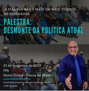 Palestra interativa “O Desmonte da Política Atual” Quando? Amanhã,23, a partir das 19h. Onde? Hotel Prime – próximo ao farol da Coroa do Meio, em Aracaju. Como? Acesse e inscreva-se: https://docs.google.com/forms/d/e/1FAIpQLSdMTaF9jCExZvlOMDl7cK6JUJQug4qcrLzSFIoAO4dDCx7AGw/viewform?usp=sf_link São apenas 50 vagas. Por quê? É importante que a sociedade conheça as principais ideias do pré-candidato Senado pelo Cidadania, seu passado e sua história.