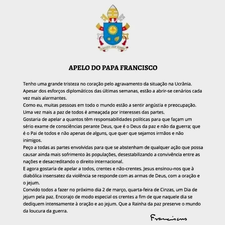 Apelo do Papa Francisco: dia 2 de março, quarta-feira de Cinzas. Oração e Jejum. Que a Rainha da Paz preserve o mundo da loucura da guerra