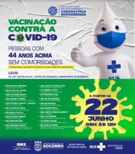 Socorro: um importante avanço na vacinação A Prefeitura de Socorro, por meio da Secretaria Municipal de Saúde (SMS), iniciará nessa terça-feira, 22, a vacinação contra a COVID-19 em pessoas a partir de 44 anos sem comorbidades. A imunização ocorrerá em 19 Unidades Básicas de Saúde do município, das 08 às 12h. Já na sede da SMS estará sendo aplicada a segunda dose da Coronavac e da AstraZeneca. Lembre-se de levar o RG, CPF, comprovante de residência, cartão do SUS, cartão de vacinação.