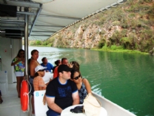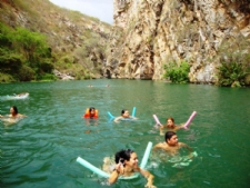 A parada para o banho está por vir. O catamarã para entre paredões e o contato com a natureza está garantindo. Logo depois o passeio continua por um canal inundado pelo rio e se chega à denominada Gruta do Santinho, uma pequena fenda no meio dos paredões. O tempo passou e nem percebeu, mas, afinal, para que relógio se a pretensão é que não se passe as horas quando se está num paraíso?
