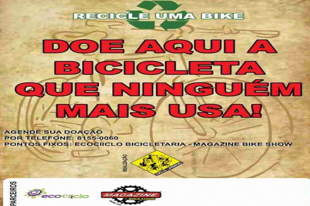 Pensando nisso, a organização não-governamental Associação Ciclo Urbano resolveu ajudar a realizar o sonho da garotada de ganhar uma bicicleta no Natal. É a campanha Recicle Uma Bike. A ONG receberá bicicletas de qualquer tamanho e em qualquer estado: novas, seminovas, usadas, quebradas. Todas passarão por revisão, manutenção, ajustes e reparos e serão doadas a crianças carentes de Aracaju.