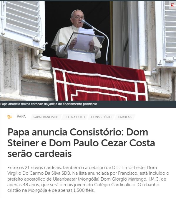 Na conclusão do Regina Coeli, ontem, 29, domingo em que a Igreja festeja a Ascensão do Senhor, o Santo Padre Francisco fez o anúncio dos novos cardeais que serão criados no Consistório a ter lugar em 27 de agosto próximo. Entre esses os brasileiros Dom Leonardo Steiner e Dom Paulo Cezar Costa; e Dom Virgilio Do Carmo Da Silva de Timor Leste. Todos os nomes aqui: https://www.vaticannews.va/pt/papa/news/2022-05/papa-francisco-regina-coeli-consistorio-novos-cardeais-agosto.html