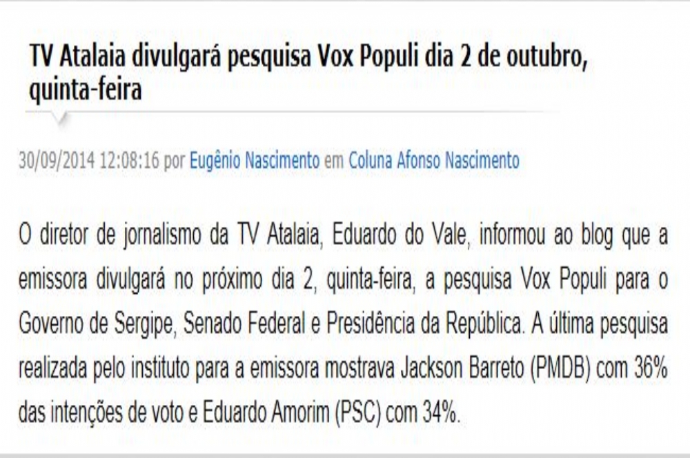 Ontem, 02, a TV Atalaia iria divulgar a última pesquisa encomendada ao instituto Vox Populi (veja quadro ao lado), mas não