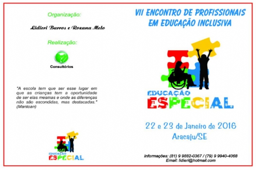 Nos dias 22 e 23 de Janeiro no Hotel Del Canto, acontecerá em Aracaju o VII Encontro de Profissionais em Educação Inclusiva