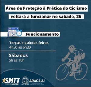 Parabéns PMA, antes tarde do que nunca A partir de amanhã, 26, a Prefeitura de Aracaju retomará o projeto da Área de Proteção à Prática do Ciclismo (APPC), que precisou ser suspenso em abril deste ano devido à intensificação das medidas restritivas estabelecidas para o enfrentamento da pandemia de covid-19. Com a reabertura da área, haverá um fechamento temporário e parcial que se repetirá semanalmente, nas terças e quintas-feiras, das 4h30 às 6h30, e aos sábado das 5h às 10h, no sentido Sul/Norte da avenida Santos Dumont, no trecho entre o antigo Hotel Parque dos Coqueiros e o Oceanário de Sergipe, visando isolar o local para a prática do ciclismo. Por isso, os motoristas precisam estar atentos às mudanças de trânsito.