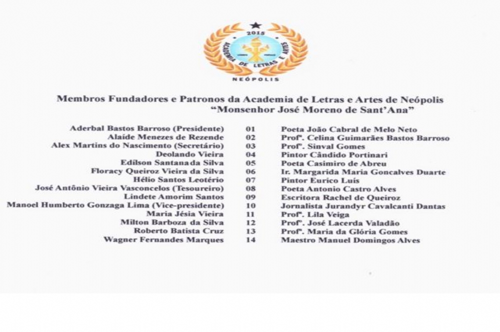 N próxima sexta-feira, 20, às 20h, será instalada a recém criada Academia de Letras e Artes de Neópolis, no auditório do fórum