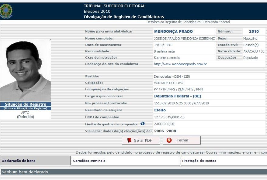 Não é possível. No último sábado, 05, o jornalista Cláudio Nunes republicou neste espaço, uma matéria publicada no site Uol (http://noticias.uol.com.br/politica/2011/02/04/tiririca-e-17-deputados-dizem-nao-ter-patrimonio.jhtm), também republicada do site Congresso em Foco, com o título “Tiririca e 17 deputados dizem não ter patrimônio”. Entre estes deputados apenas um de Sergipe, Mendonça Prado, do DEM. Jornalista irresponsável, esse tal de Cláudio Nunes. Republica uma matéria do site UOL, que ninguém conhece. Não é um grande provedor, e muito menos um grande portal de notícias do país. Só quem deve acessar este site é o próprio Cláudio Nunes e o dono. Ninguém conhece a UOL e muito menos esta tal de “Congresso em Foco”. Vai ver o dono deve ser Cláudio Nunes. Deve estar no nome de algum “laranja” dele, assim como dizem que Cláudio tem um “laranja” num posto de gasolina de Aracaju. Por isso o deputado Mendonça Prado está correto em processar esse Cláudio Nunes. Tem que dá explicações a Justiça. Certos estão a UOL e o Congresso em Foco, os autores da matéria, que não precisavam ouvir Mendonça. Aliás, esse Cláudio Nunes já deveria ter sido processado por Mendonça Prado durante a campanha eleitoral do ano passado. Três meses antes das eleições, no blog dele (que ninguém lê), Cláudio Nunes apostou com os leitores que Mendonça Prado seria eleito e alcançaria a legenda partidária, quando todo mundo da imprensa e quase todos os políticos, diziam que o DEM e os demais partidos coligados não alcançariam a legenda necessária para eleger um deputado federal. Cláudio Nunes foi tendencioso porque se alguém tinha duvida em votar em Mendonça Prado por conta da legenda, com a aposta dele, e as constantes notas colocando o deputado como reeleito, pode ter angariado votos pára Mendonça. Um absurdo! Então é isso. A culpa não é da UOL e muito menos do Congresso em Foco. A culpa é de Cláudio Nunes que republicou a matéria. Ele é o responsável por tudo. Que a Justiça o condene e se possível o coloque no seu devido lugar: atrás das grades. É uma pena que a Justiça não pode tirar de Cláudio Nunes o seu maior patrimônio: o caráter e a credibilidade perante a uma dúzia de leitores. Aí, só tem um jeito, censurando… Prado no twitter No sábado após a republicação da matéria do site UOL, pelo twitter, o deputado Mendonça Prado postou: “ O jornalista Cláudio Nunes deveria ter maior responsabilidade ao publicar os seus textos. Me dará explicações na Justiça. Meu patrimônio também foi declarado à Justiça Eleitoral. Portanto, não estou entendendo o motivo das mentiras em relação a mim. Informações de que eu não declarei patrimônio são mentirosas. Declaro anualmente à receita federal e à câmara dos deputados. Tenho certeza que está havendo um equívoco e pedirei à câmara para fazer o devido esclarecimento” Mendonça Prado rebate informação inverídica I A assessoria de comunicação de Mendonça após postar no twitter dizendo que este jornalista infringiu a lei de imprensa ao reproduzir denúncia se ouvir enviou a seguinte nota que está sendo publicada integra: “O deputado federal Mendonça Prado lamentou a divulgação falsa através de uma nota que informa que ele não declarou possuir patrimônio. Segundo ele, a sua declaração é entregue anualmente à Câmara dos deputados e a Receita Federal, até porque a lei brasileira assim determina. Portanto, não há que se falar nesse tipo de erro, já que ele assumiu mandato de deputado federal pela terceira vez consecutiva, logo, os dados já foram entregues ao parlamento de forma reiterada”. Mendonça Prado rebate informação inverídica II Outro ponto que ele achou intrigante relativo ao assunto, é que alguns veículos de comunicação tiveram acesso aos dados concernentes ao seu patrimônio no momento em que registrou a candidatura para deputado federal em 2010. Portanto, são informações públicas devidamente aprovadas pela Justiça Eleitoral. “Tenho o meu patrimônio devidamente declarado à Receita Federal e à Câmara dos Deputados, conforme determina a Lei. Não poderia, portanto, omitir, pois estaria cometendo um crime. Assim, lamento as informações inverídicas e a disseminação delas por parte de alguns setores. Lamento que esse equívoco tenha ocorrido e ensejado algumas insinuações maldosas” disse Mendonça Prado. A bem da verdade Mesmo não sendo responsável pela autoria da matéria republicada neste espaço, por dever de Justiça e a bem da verdade, publica um documento do Tribunal Superior Eleitoral (onde mostra os dados do registro da candidatura de Mendonça Prado no ano passado. Com certeza a UOL e o Congresso em Foco tenham fizeram a pesquisa no site do TSE, nada mais normal. Veja caro leitor, no final, que Mendonça Prado, tem “nenhum bem declarado”: Mendonça sem bens De uma coluna Plenário do jornalista Diogénes Brayner, no último domingo no Correio de Sergipe: O deputado federal Mendonça Prado (DEM) é o único parlamentar a constar dos dezoito que declaram nenhum bem. Isso foi constatado pela análise das declarações de renda dos novos parlamentares empossados esta semana. Outro que está na relação dos que não tem bens é o deputado Tiririca (PR-SP), considerado o fenômeno eleitoral do pleito passado. Bens Deu na coluna de Gilvan Manoel, no Jornal do Dia do último sábado, o5: “O deputado federal Mendonça Prado (DEM) declarou não possuir nenhum bem. Nem mesmo um carrinho. Já Almeida Lima (PMDB) está entre os mais ricos da Câmara. Declarou um patrimônio superior a R$ 2 milhões. Agradecimento O titular de espaço (ainda) agradece ao amigos e leitores que ligaram e enviaram e-mails no sábado sendo solidários ao processo judicial que será movido por conta da republicação da matéria da UOL. Pede a compreensão para não publicar alguns e-mails recebidos que criticam durame