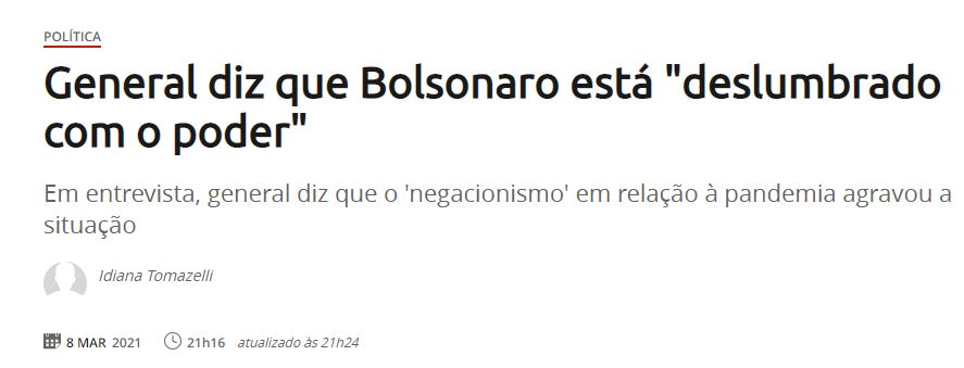 General diz que Bolsonaro está “deslumbrado com o poder” Em entrevista, general diz que o ‘negacionismo’ em relação à pandemia agravou a situação. Uma das entrevistas mais realista e pertinente publicada ultimamente: Candidato bolsonarista ao governo do Distrito Federal pelo PRP em 2018, o general da reserva Paulo Chagas foi apoiador de primeira hora do presidente Jair Bolsonaro, mas hoje considera o ex-aliado um deslumbrado com o poder. “O caminho correto seria o presidente baixar a bola e entender qual é a missão dele”, disse o militar em entrevista ao Estadão/Broadcast.