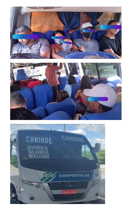 Quem fiscaliza a Coopertalse? Motoristas estão impondo aos passageiros que façam viagens de mais de 2 horas com as janelas fechadas e ar-condicionado ligado. Muitos passageiros sem máscaras Para muitos, a pandemia da coronavírus parece que não existe. A Coopertalse, cooperativa que faz o transporte intermunicipal – diga-se de passagem sem licitação e ninguém tem a coragem de tomar uma providência, nem mesmo o MPE cobra na Justiça a licitação – agora determinou aos motoristas que continuem com as janelas fechadas e o ar-condicionado ligado em viagens longas e o pior: não cobram o uso da máscara aos passageiros. Um descaso total e ninguém fiscaliza. Nem mesmo a vigilância sanitária. A quem recorrer? Uma prova: fotos enviadas por um passageiro do ônibus cujo trajeto final é Canindé, passando por Monte Alegre, Glória e Dores: