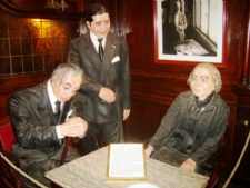 estão presentes no Tortoni. Nas paredes, quadros da revolução, dos personagens, além de bonecos de cera dos freqüentadores ilustres, concebidos pelo arquiteto Gustavo Fernádez. Além do salão principal, há um mini-teatro onde se pode conferir o melhor do tradicional tango.