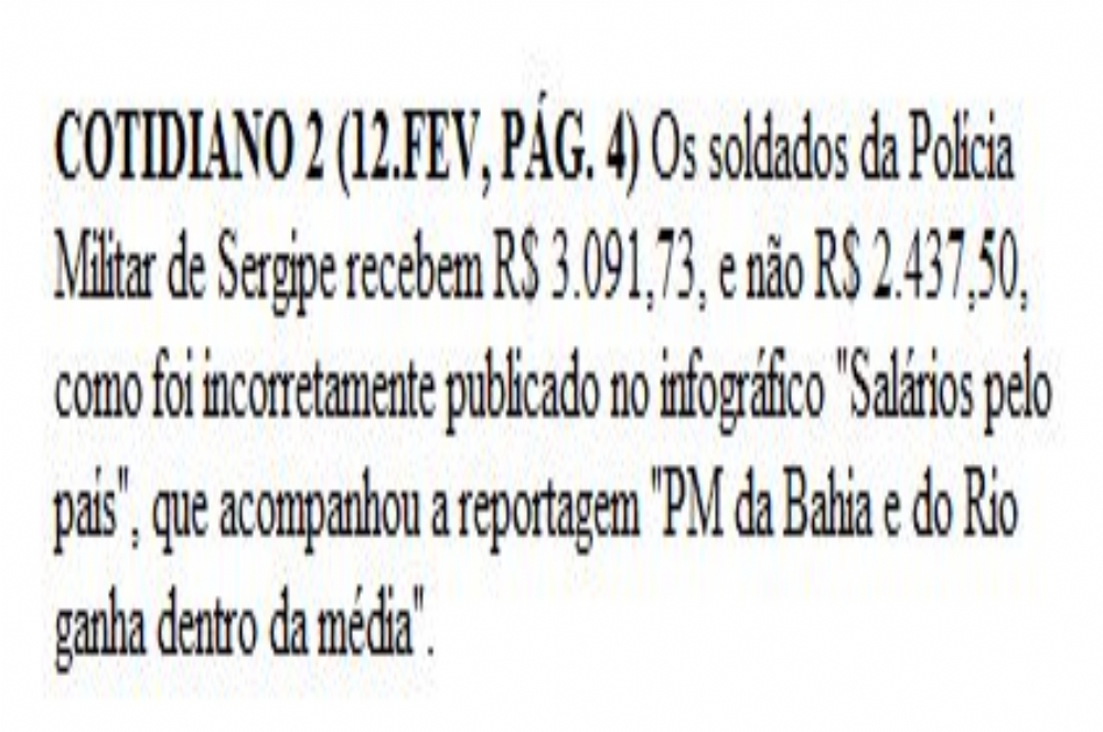 | FSP, de hoje, 15, publicar correção da matéria do dia 12, sobre salários da PM/SE. |