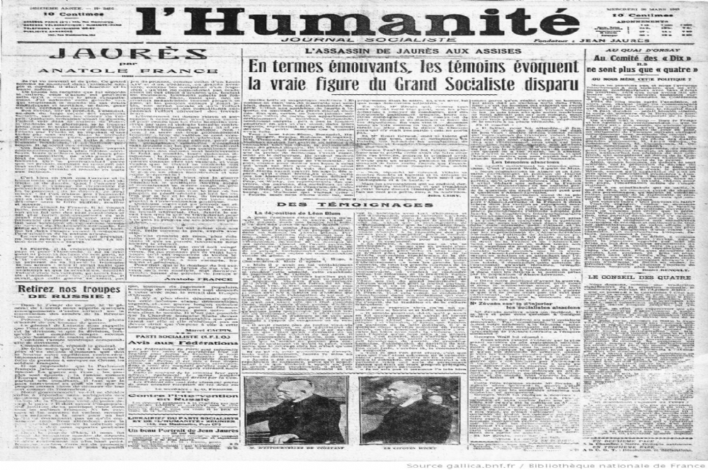| Humanité sobre o assassinato de Jean Jaurès. |