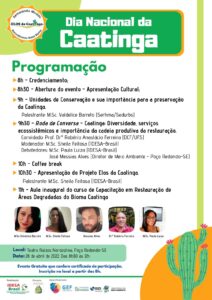 Dia Nacional da Caatinga Em homenagem ao Dia Nacional da Caatinga, acontecerá no dia 28 de abril, um encontro com a proposta de discutir sobre a cadeia produtiva de restauração, conjuntura, perspectivas, desafios e potencialidades do bioma Caatinga. Será realizado no Teatro Raízes Nordestinas, localizado na cidade de Poço Redondo e reunirá representantes das unidades de conservação, UFS, IFS, Comitê da Bacia Hidrográfica do Rio São Francisco, Secretarias Municipal e Estadual do Meio Ambiente, Cadeia Florestal e atores da unidade conservadora da Grota do Angico. O evento realizado pela Idesa Brasil (Instituto de Desenvolvimento Sócio-Ambiental), será exclusivamente sobre o bioma Caatinga e vai se dividir em palestra, roda de conversa, apresentação de projeto e aula inaugural. O evento é gratuito e contará com certificado de participação. A inscrição para participar será no local do evento a partir das 8h. Participe!