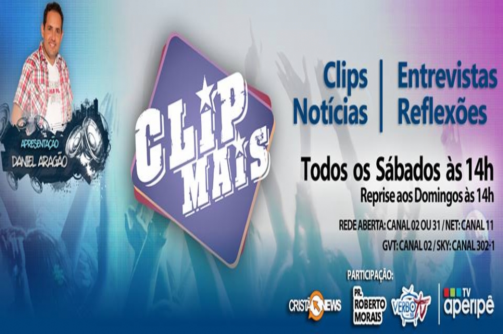 O programa é exibido aos sábados, às 14h, com reprise aos domingos no mesmo horário. E a partir do dia 16 de Novembro o Clip Mais será exibido de segunda a sexta-feira, ao vivo, das 18h às 18h30. “Será uma grande responsabilidade fazer um programa ao vivo mas estou muito animado com o projeto e queremos que o nome do Senhor seja glorificado nesse espaço”, conclui Daniel Aragão.