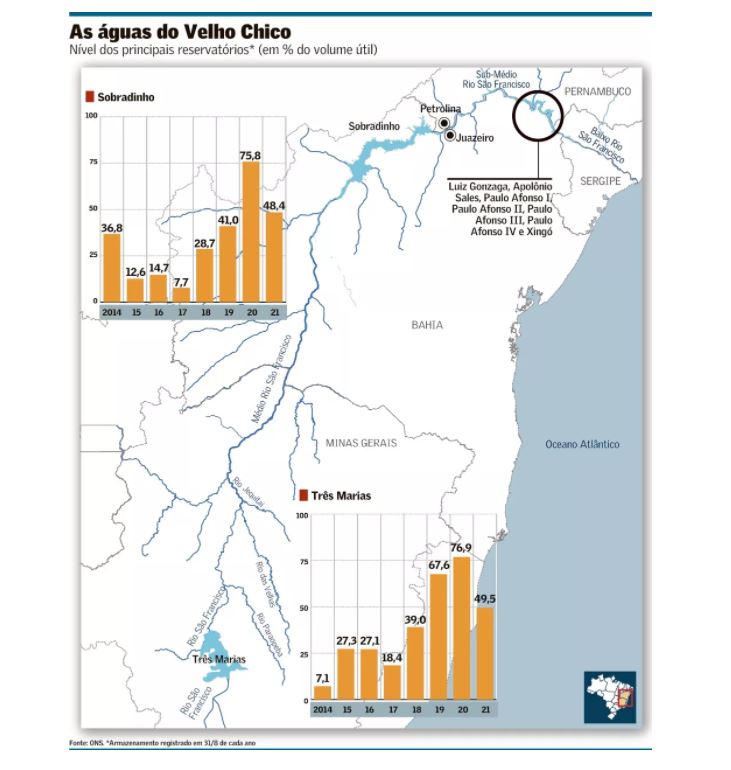 Situação dramática em meio à seca na década passada Na terça-feira, após reunião da Câmara de Regras Excepcionais para Gestão Hidroenergética (CREG), o ministério anunciou que a usina de Três Marias (MG) passará a liberar até 650 litros por segundo nos próximos três meses. Já a represa de Sobradinho (BA) terá uma defluência máxima de 1.500 litros por segundo em setembro, chegando a 2.500 litros em outubro e novembro. Para ter uma ideia do que significam esses volumes: na década passada, em meio à seca que levou a bacia do São Francisco a uma situação dramática, a vazão foi reduzida para menos de 100 litros por segundo em Três Marias e apenas 550 litros por segundo em Sobradinho. Seus reservatórios atingiram uma marca, respectivamente, de 6% e 2% no auge da estiagem em 2017. Leia toda matéria aqui.