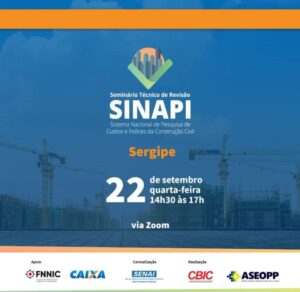 Seminário técnico de revisão do Sinapi, dia 22, às 14h30 A próxima edição do Seminário Técnico de Revisão do Sistema Nacional de Pesquisas de Custos e Índices da Construção Civil (Sinapi) – referência oficial para a elaboração do orçamento de obras que empregam recursos do Orçamento Geral da União (OGU) – será em Sergipe, no dia 22/9, às 14h30. No encontro serão apresentados e debatidos com empresários e profissionais orçamentistas da indústria da construção os aspectos que podem favorecer a elaboração de orçamentos por órgãos públicos e empresas privadas. A ideia é sanar dúvidas dos usuários de Sergipe sobre como quantificar o serviço e se a sua referência está adequada para a situação ou condições da obra.