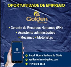 Golden Turismo abre vagas de emprego em Nossa Senhora da Glória Existente no mercado turístico desde 2001, a empresa Golden Turismo está com vagas abertas para motoristas, gerente de Recursos Humanos (RH), assistente administrativo e mecânico, em Nossa Senhora da Glória. Os candidatos às vagas de motoristas precisam ter habilitação categoria D, e os requisitos para gerência de RH e assistentes administrativos são experiências nas áreas. Para atuar na área de mecânica, o candidato precisa ter experiência em mecânica de linha leve ou pesada. Os interessados devem enviar o currículo para o e-mail goldenturismo@yahoo.com