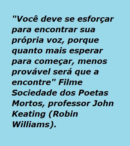“Você deve se esforçar para encontrar sua própria voz, porque quanto mais esperar para começar, menos provável será que a encontre” Filme Sociedade dos Poetas Mortos, professor John Keating (Robin Williams).