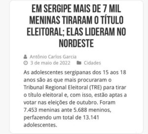 www.twitter.com/AndreMouraSE Mais de 7 mil vezes elas! Muito orgulho das meninas sergipanas que já garantiram o título de eleitor e estão dando exemplo de compromisso com a democracia, colocando Sergipe no topo do Nordeste, como o estado que mais emitiu títulos de eleitor para mulheres de até 16 anos.
