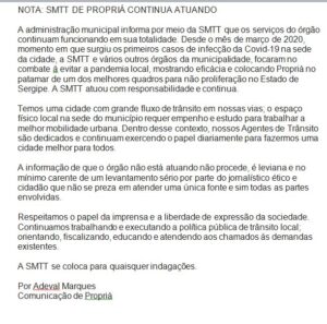 Ontem, 25, com base em um vídeo – não publicado pelo blog – enviado por moradores de Propriá mostrando a omissão da SMTT não fiscalizando os motociclistas que transitam sem capacetes e sem respeitar as regras do trânsito, o órgão enviou uma nota (vide o print ao lado) onde em um parágrafo faz grave acusação a este espaço: “a informação de que o órgão não está atuando não procede, é leviana e no mínimo carente de um levantamento sério por parte do jornalístico ético e cidadão que não se preza em atender uma única fonte e sim todas as partes envolvidas.”