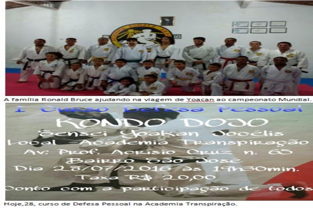 disputa do Mundial da Indonésia no fim do mês de agosto. A família Ronald Bruce, ajudou. E também o professor José Vlademir. Hoje, 28, tem Curso de Defesa Pessoal na Academia Transpiração Kondo Dojo (praça da Imprensa), ministrado por ele, o sensei Yoacan. Será as 19h30 com o preço de apenas R$ 20,00.