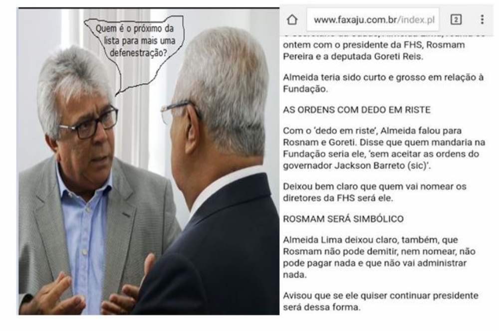 alternos ou de fato, que têm a sua própria sesmaria para chamar de sua. Pelo menos é o que tenta passar Almeida Lima para os sergipanos. O que ele fez com o novo presidente da FHS, dizendo que lá quem manda é ele e que será um mero presidente decorativo sem aceitar as ordens de Jackson Barreto é a desmoralização total (Veja o print da conversa ao lado do fax aju de Brayner).